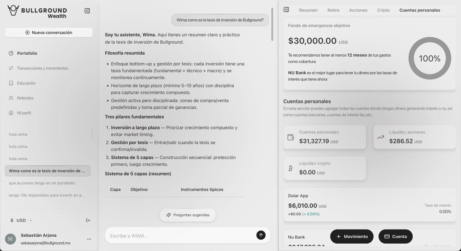 “A diferencia de herramientas de Inteligencia Artificial como Chat GPT o Claude, WiMA está realmente conectada con las inversiones del usuario dentro de la plataforma. No se queda en respuestas genéricas: entiende el contexto financiero de cada persona y ofrece orientación basada en datos reales. Detrás hay un sistema creado junto a especialistas financieros y analistas certificados (CFAs), que garantizan que cada recomendación siga los mismos estándares de inversión que usamos en Bullground.” Comenta Leonardo Vilchis.