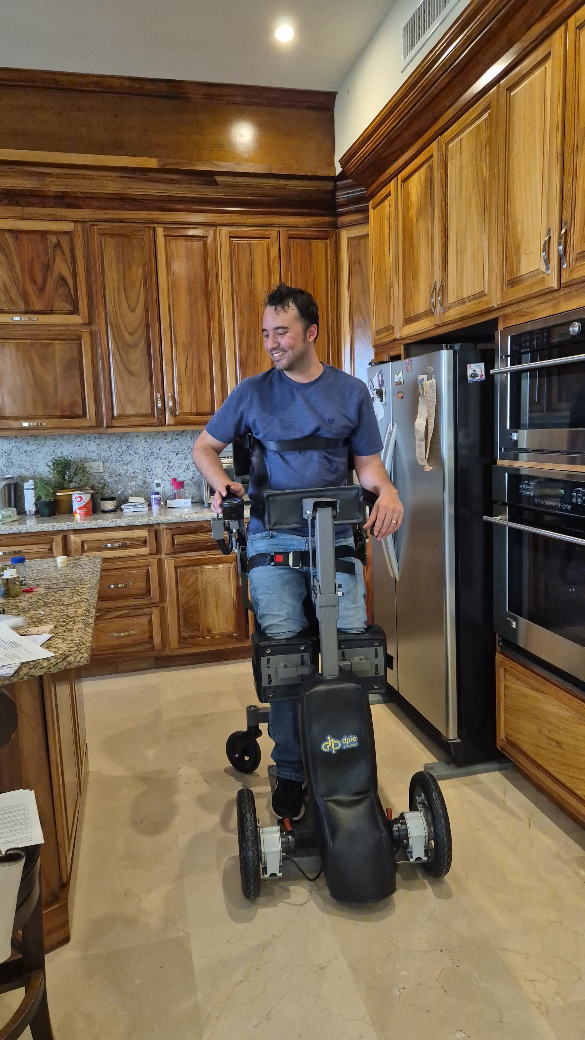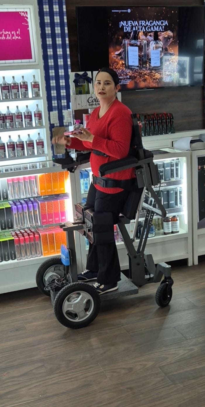 robótico único en su tipo, diseñado para permitir que personas en sillas de ruedas o con movilidad reducida puedan ponerse de pie y desplazarse de manera autónoma utilizando un joystick.